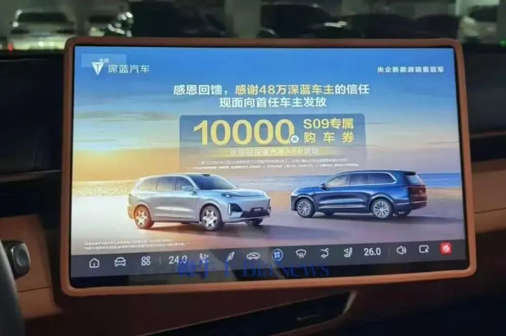 近日,有大量深蓝汽车车主在社交媒体上反映,深蓝汽车强制在车内屏幕上投放广告。广告内容为:“感恩48万深蓝车主信任,现面向首任车主发放10000元S09购车券。”