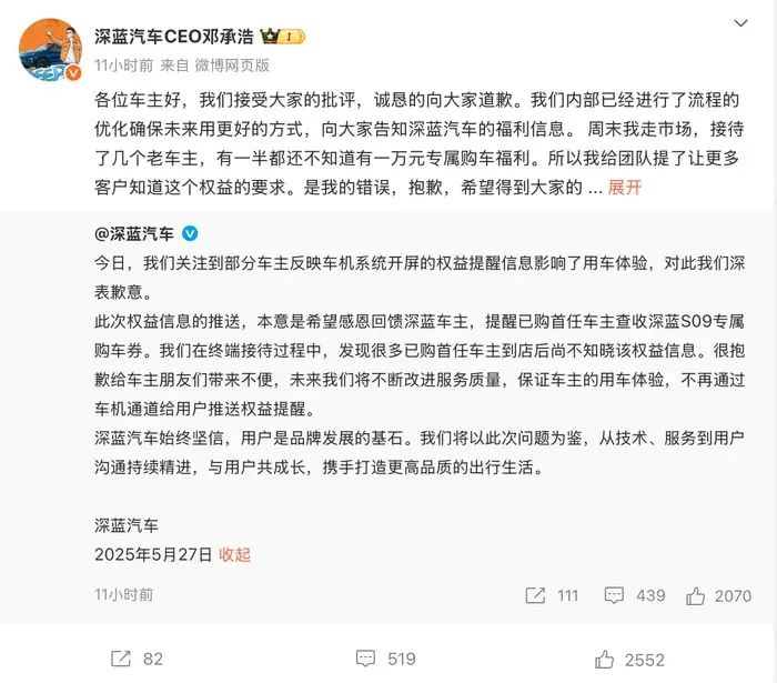 5月27日晚,深蓝汽车方面在社交平台发文称:“今日,我们关注到部分车主反映车机系统开屏的权益提醒信息影响了用车体验,对此我们深表歉意。”